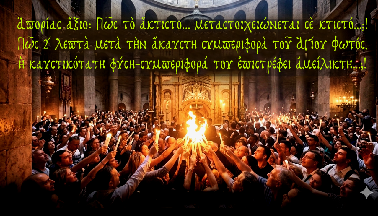 «Νυν πάντα πεπλήρωται Φωτός… ουρανός τε και γη και τα καταχθόνια…» (Από την Υμνολογία της Αναστάσεως) ΕΡΜΗΝΕΙΑ: Όλα, πλέον, έχουν πλημμυρίσει από Φως ανέσπερο: ο ουρανός και η γη και τα σκοτεινά υπόγεια του άδη… Το Αναστάσιμο Φως που ξεχύθηκε σε όλη την Κτίση, από τον Ζωοδόχο Τάφο του Χριστού, δεν ήταν κτιστό… σαν το φως του δύοντος ηλίου, που ανατέλει το πρωί και βασιλεύει το δείλι. Το “Αυτόφωτον Σέλας” είναι προαιώνιο κι’ αείφωτο… άκτιστο κι’ αδημιούργητο… άδυτο κι’ ανέσπερο… ζωηφόρο και ζωοποιό… ένδοξο και δοξαστικό… ένθεο και θεοποιό…! Ο…